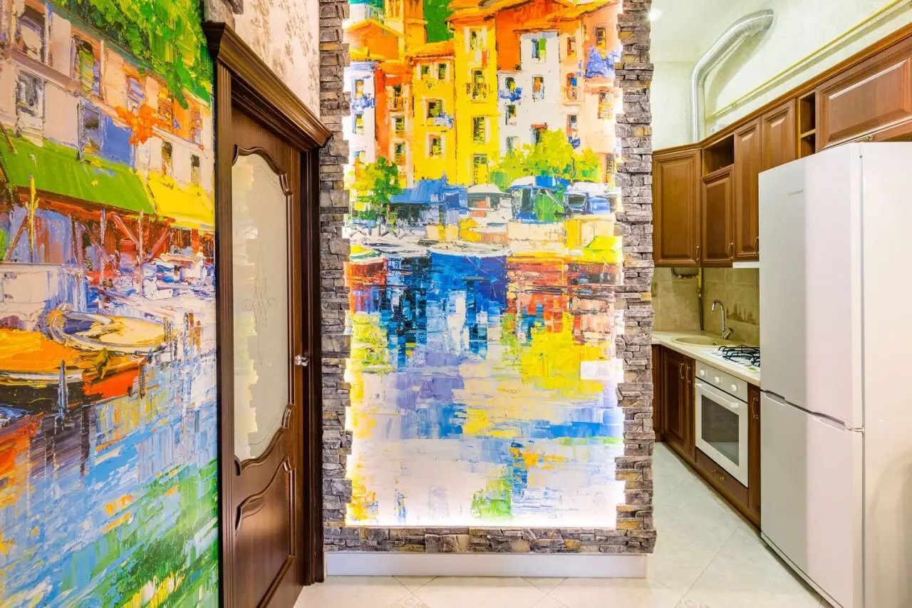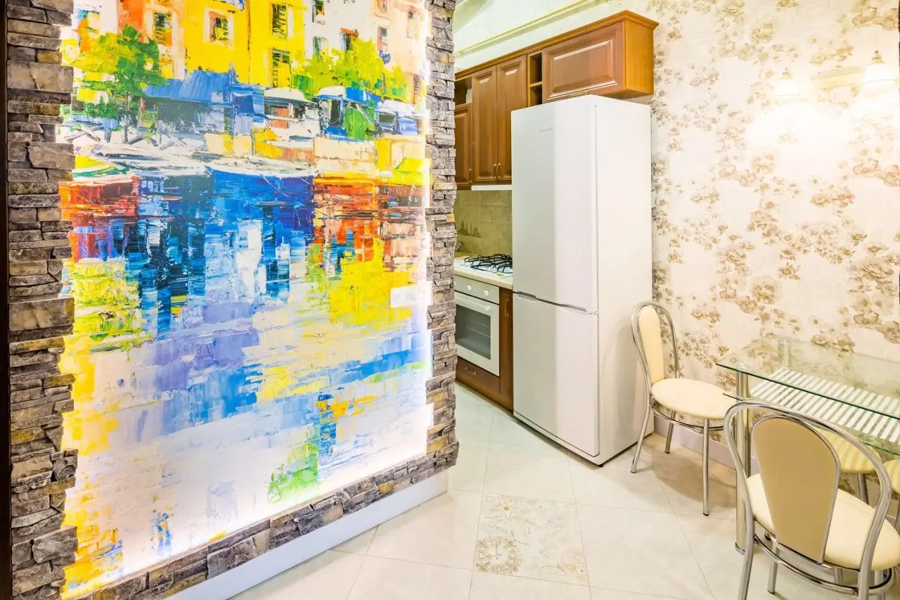 The small but functional kitchen is equipped with all the necessary kitchen and dining utensils, so you can easily prepare your favorite dishes. And right at the entrance, you will be greeted by a unique wardrobe with an impressive painting that reproduces the landscapes of old Lviv across its entire width.
